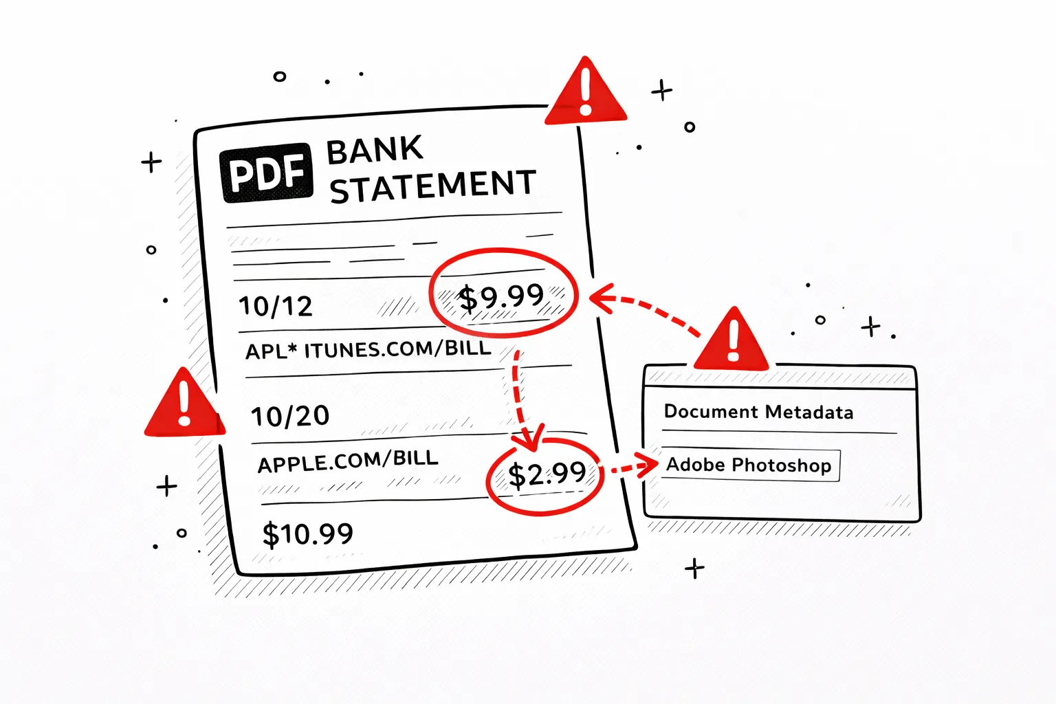 PDF metadata is another blind spot. When someone edits a bank statement in Adobe Acrobat or Photoshop, the file's internal metadata records which software made the change and when. Banks don't generate statements in Photoshop — so if the metadata says “Adobe Photoshop CC”, that's a clear red flag. Manual review never looks at metadata. Automated verification always does.